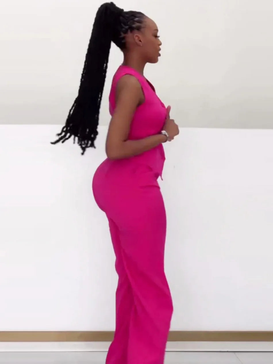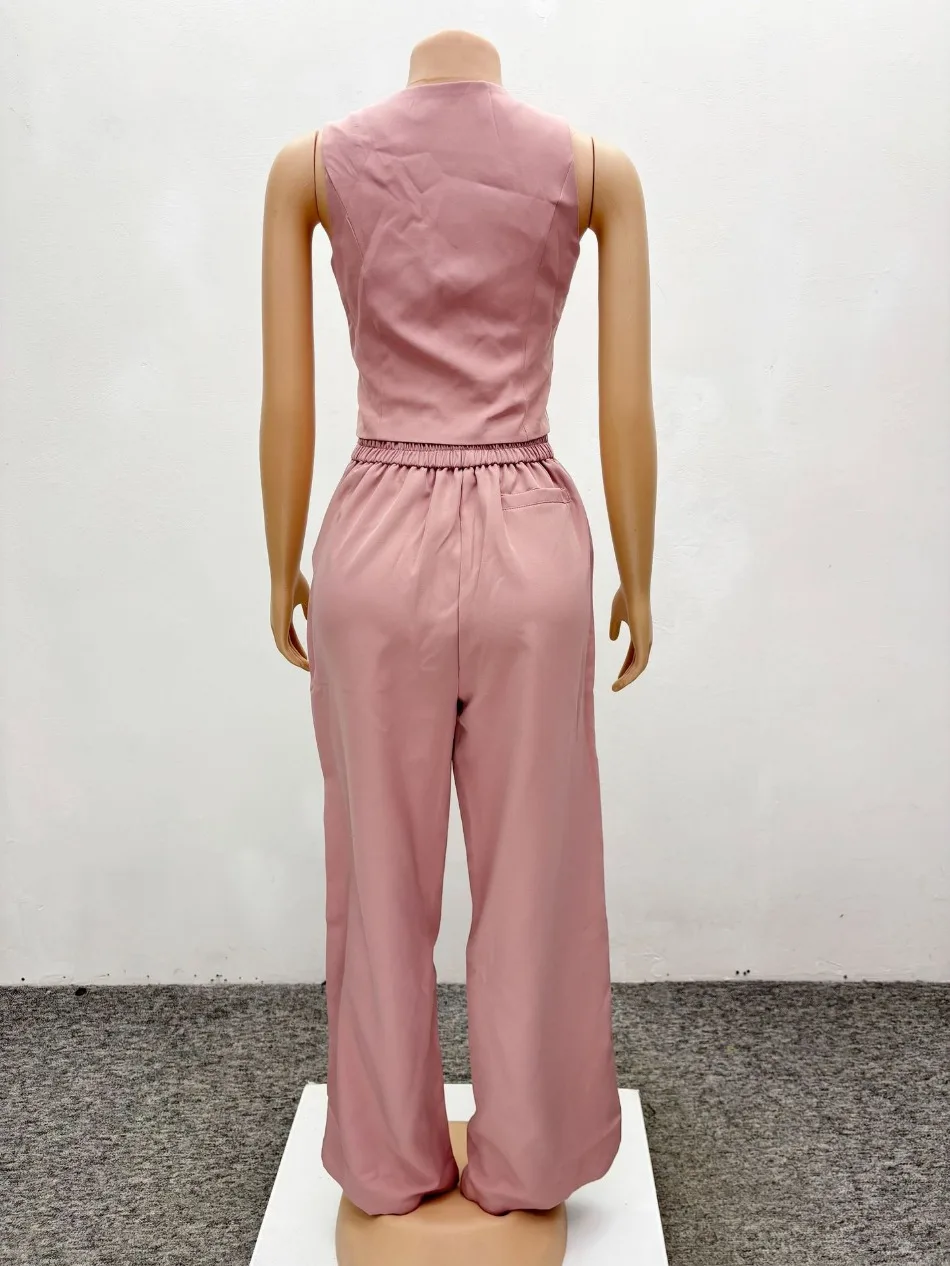 Set da due pezzi alla moda Completi da donna da ufficio Set da donna Tinta unita senza maniche con bottoni Gilet Camicia e pantaloni a gamba larga Set